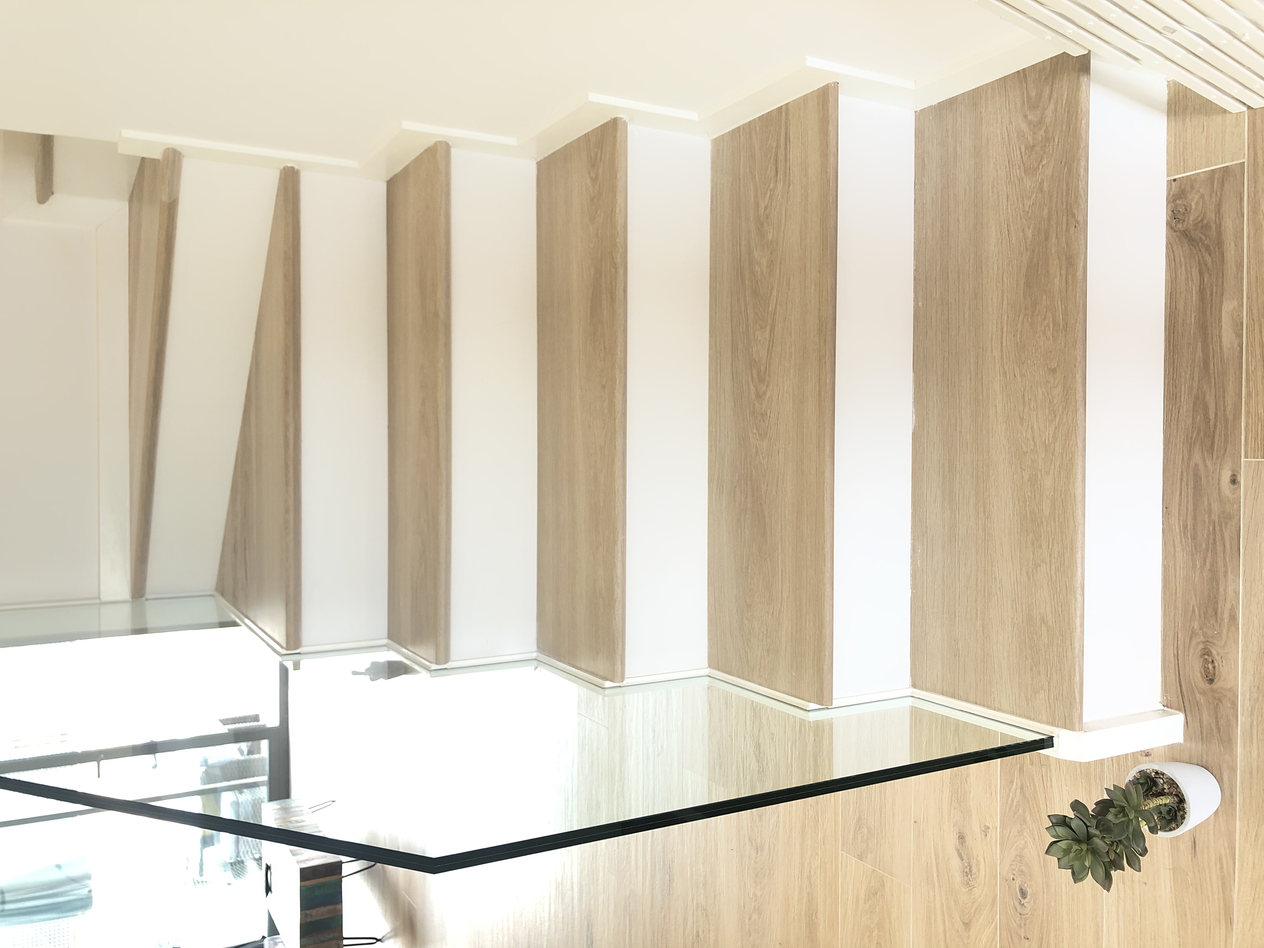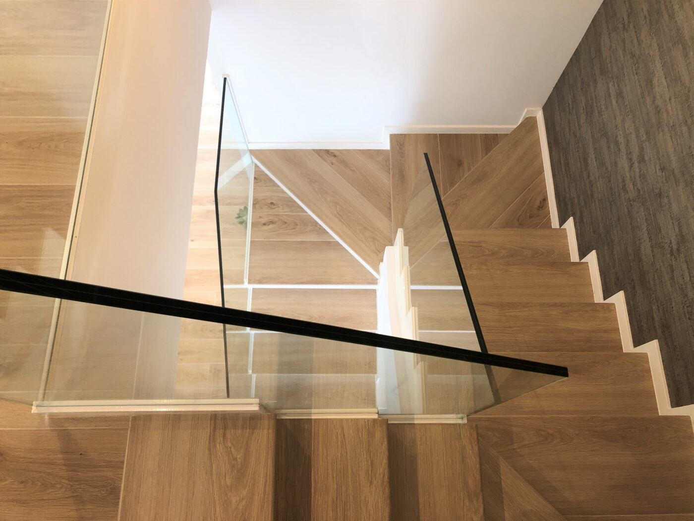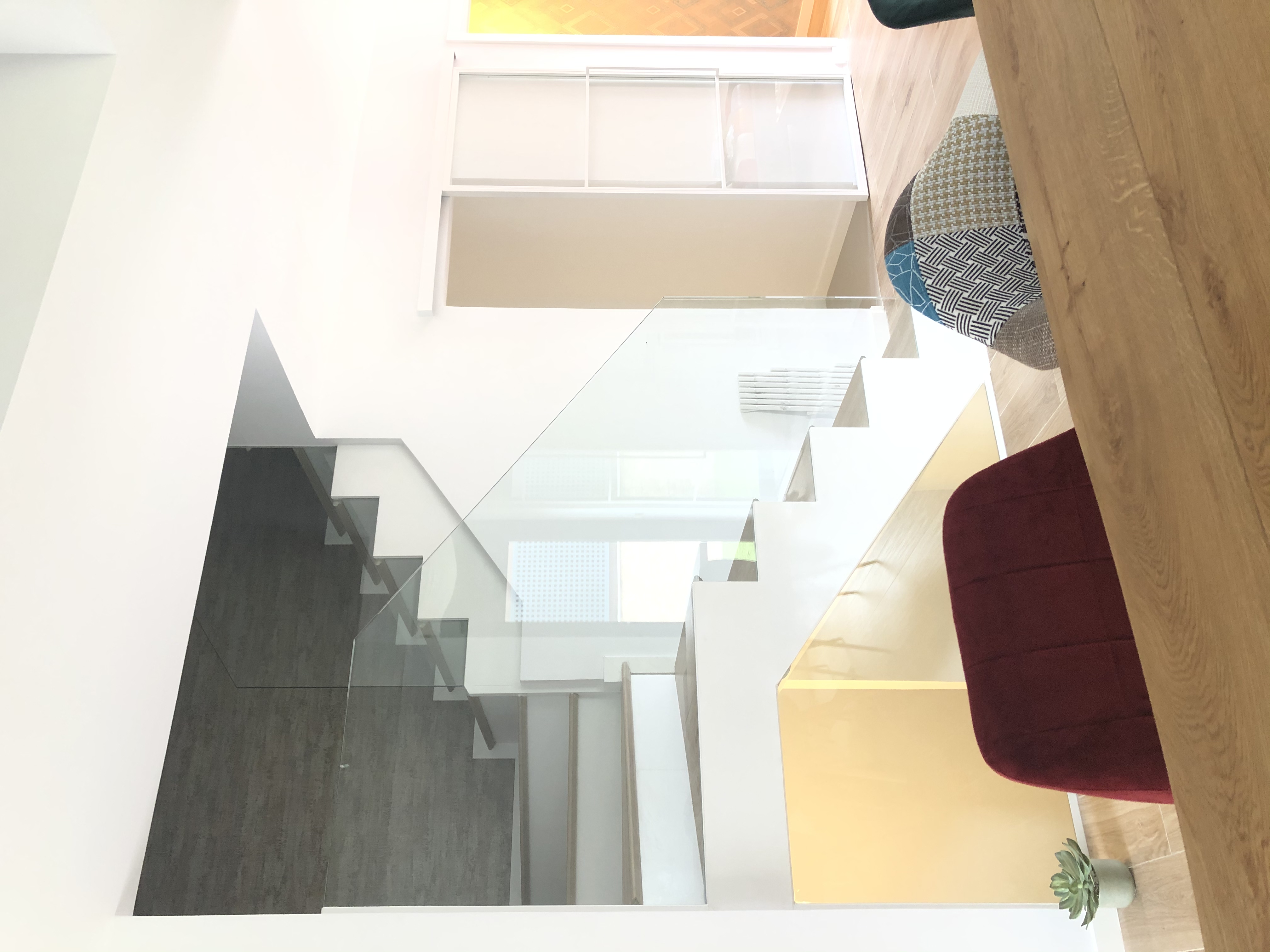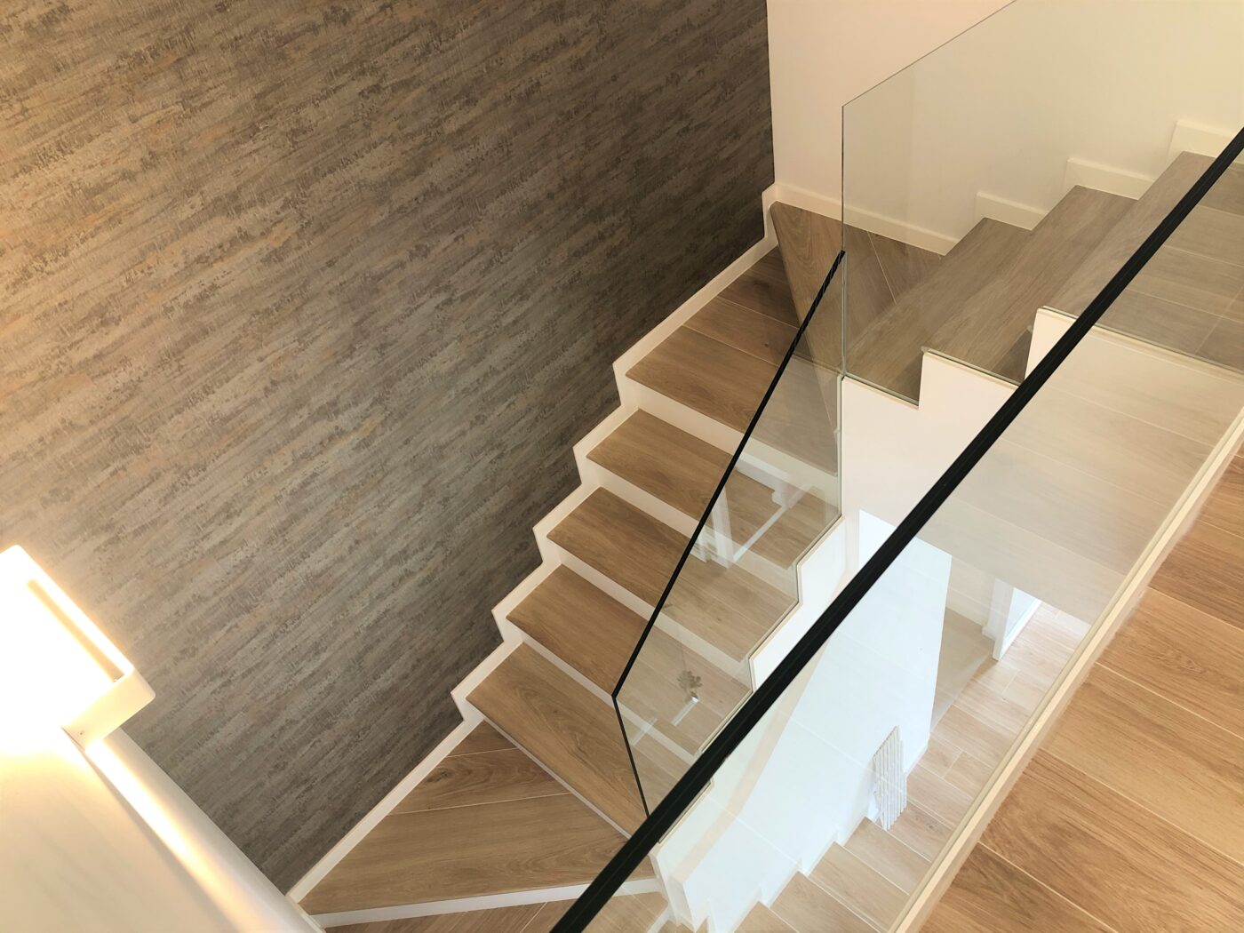 La propuesta que le hicimos a nuestros clientes, fue abrirla y poner una maravillosa barandilla de cristal para realzarla y darle mayor amplitud. También se decoro con un precioso papel pintado, que le daba profundidad y color.
