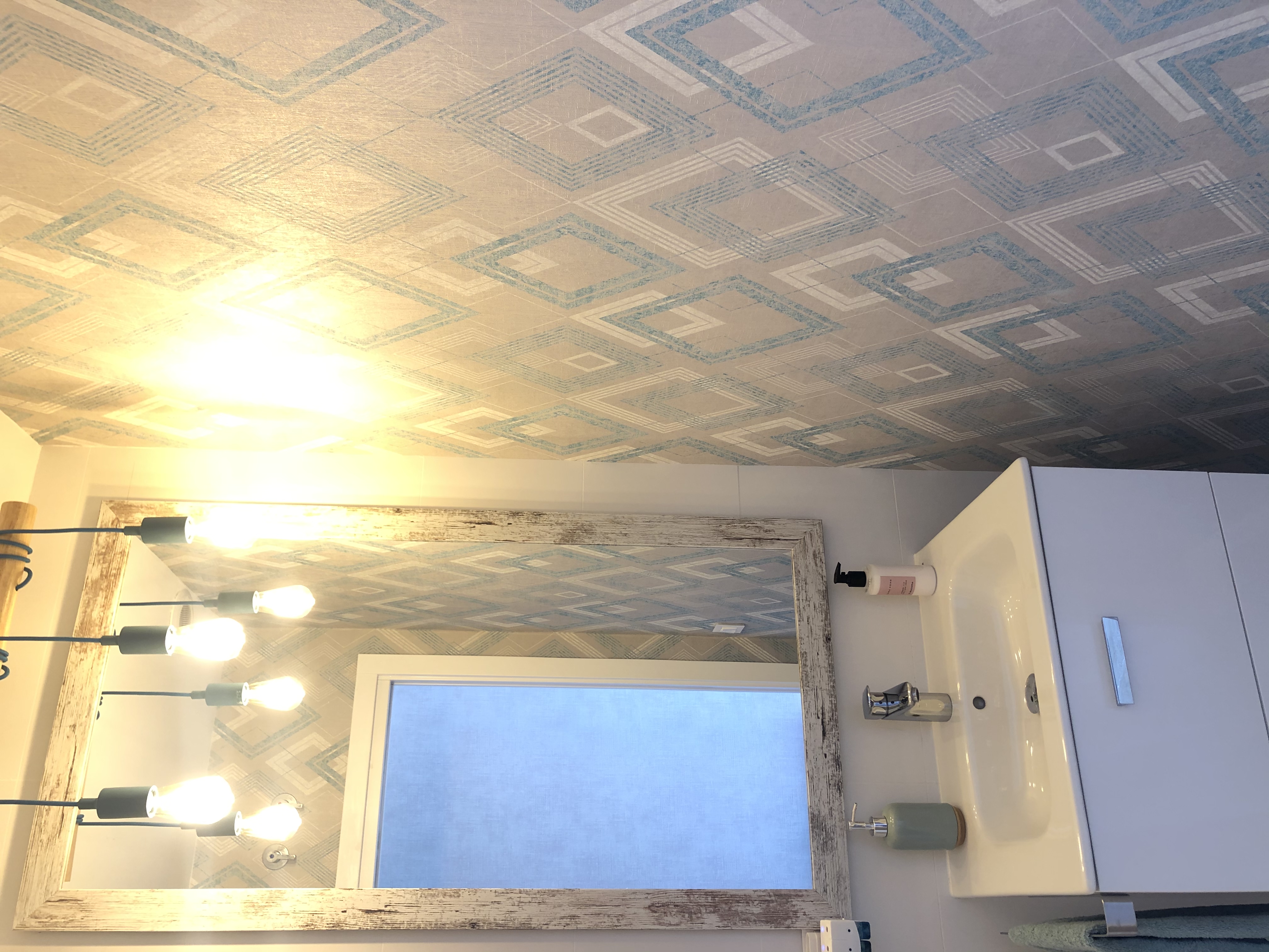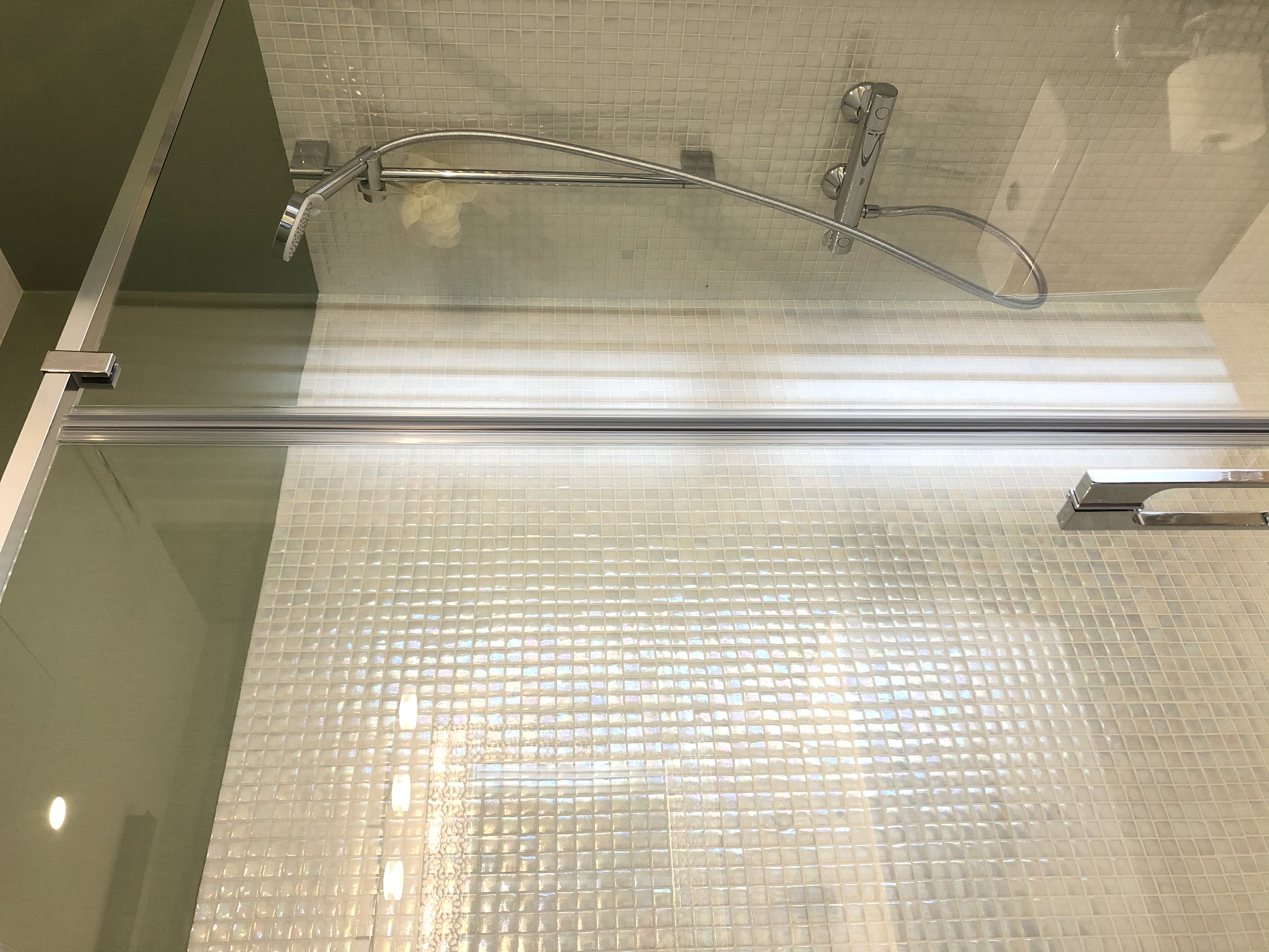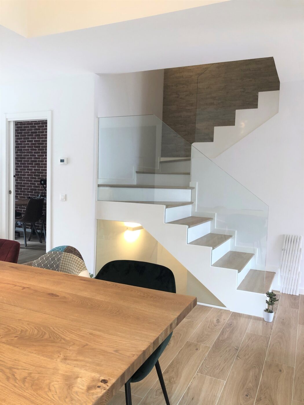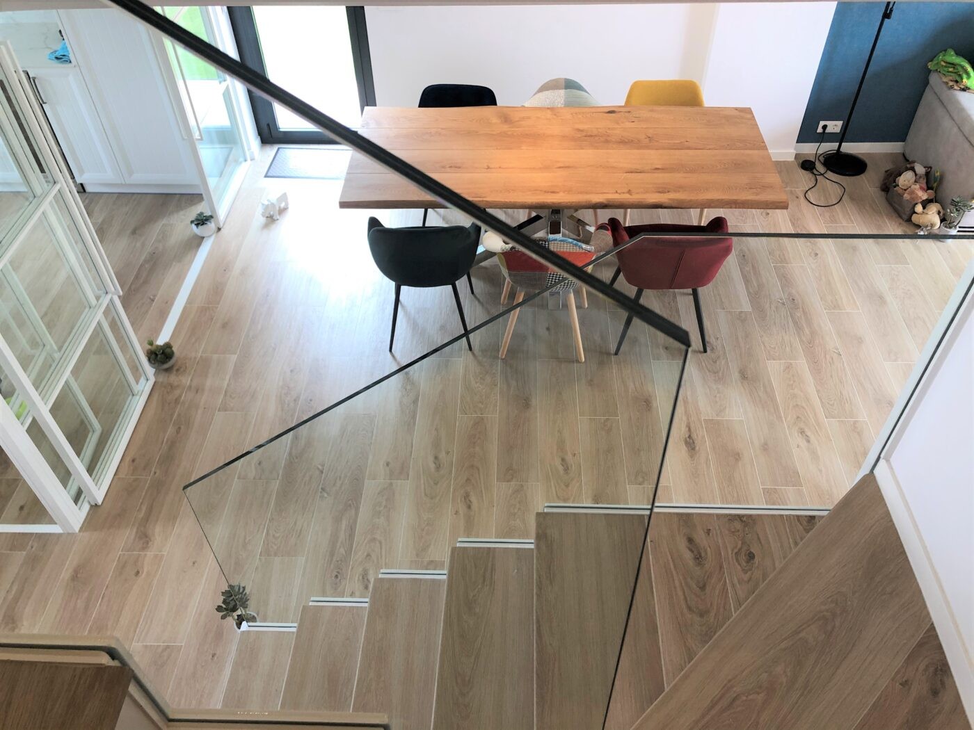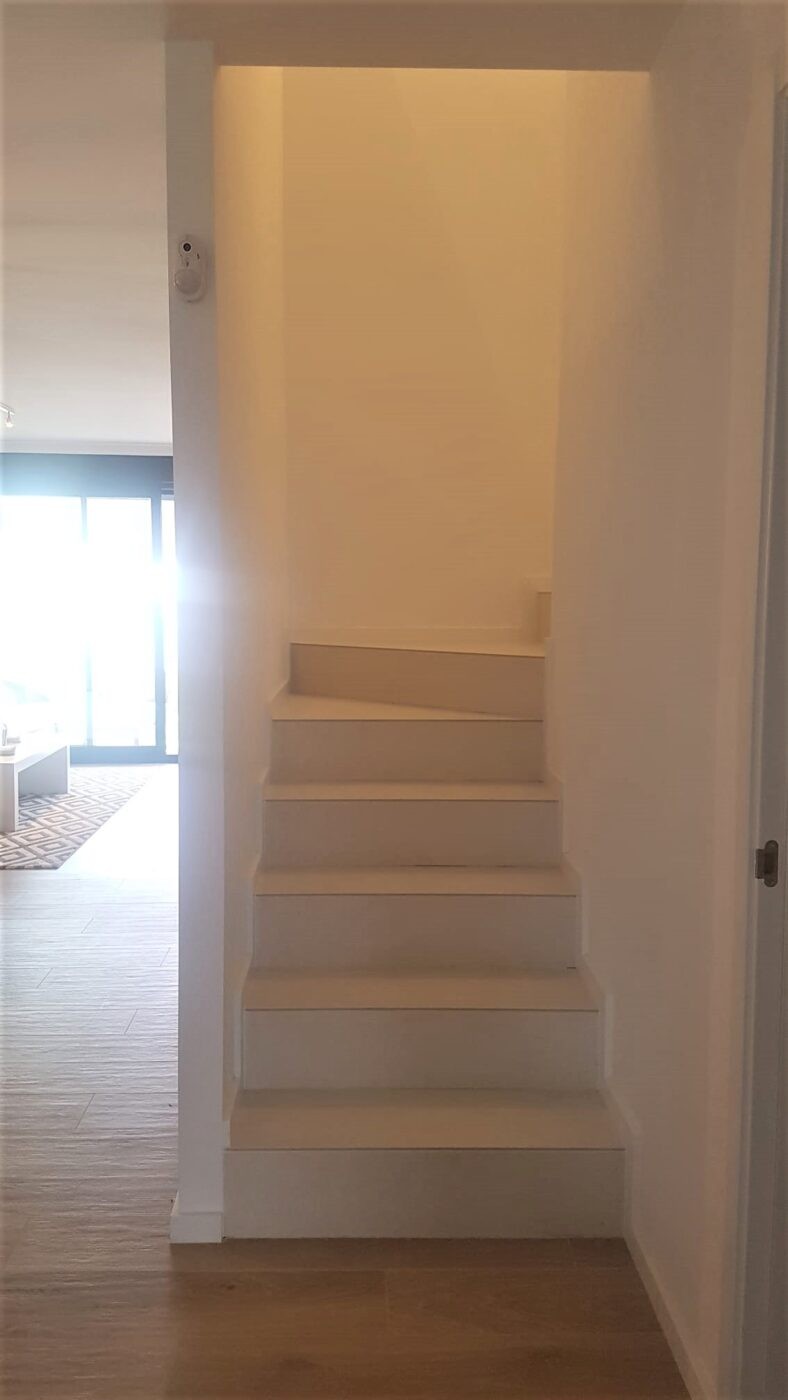 La propuesta que le hicimos a nuestros clientes, fue abrirla y poner una maravillosa barandilla de cristal para realzarla y darle mayor amplitud. También se decoro con un precioso papel pintado, que le daba profundidad y color.