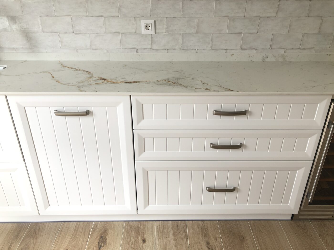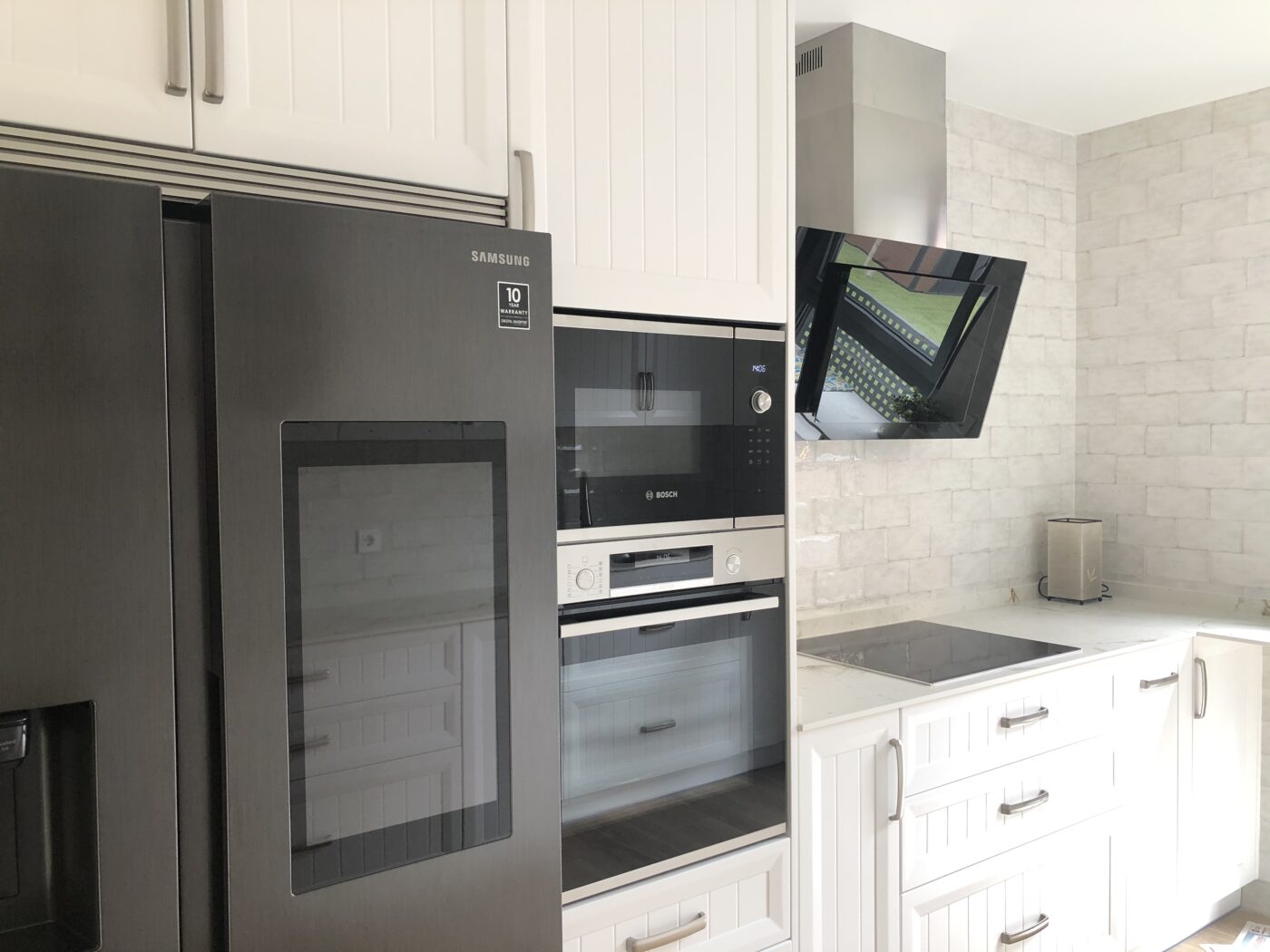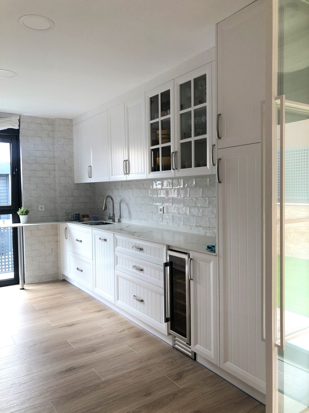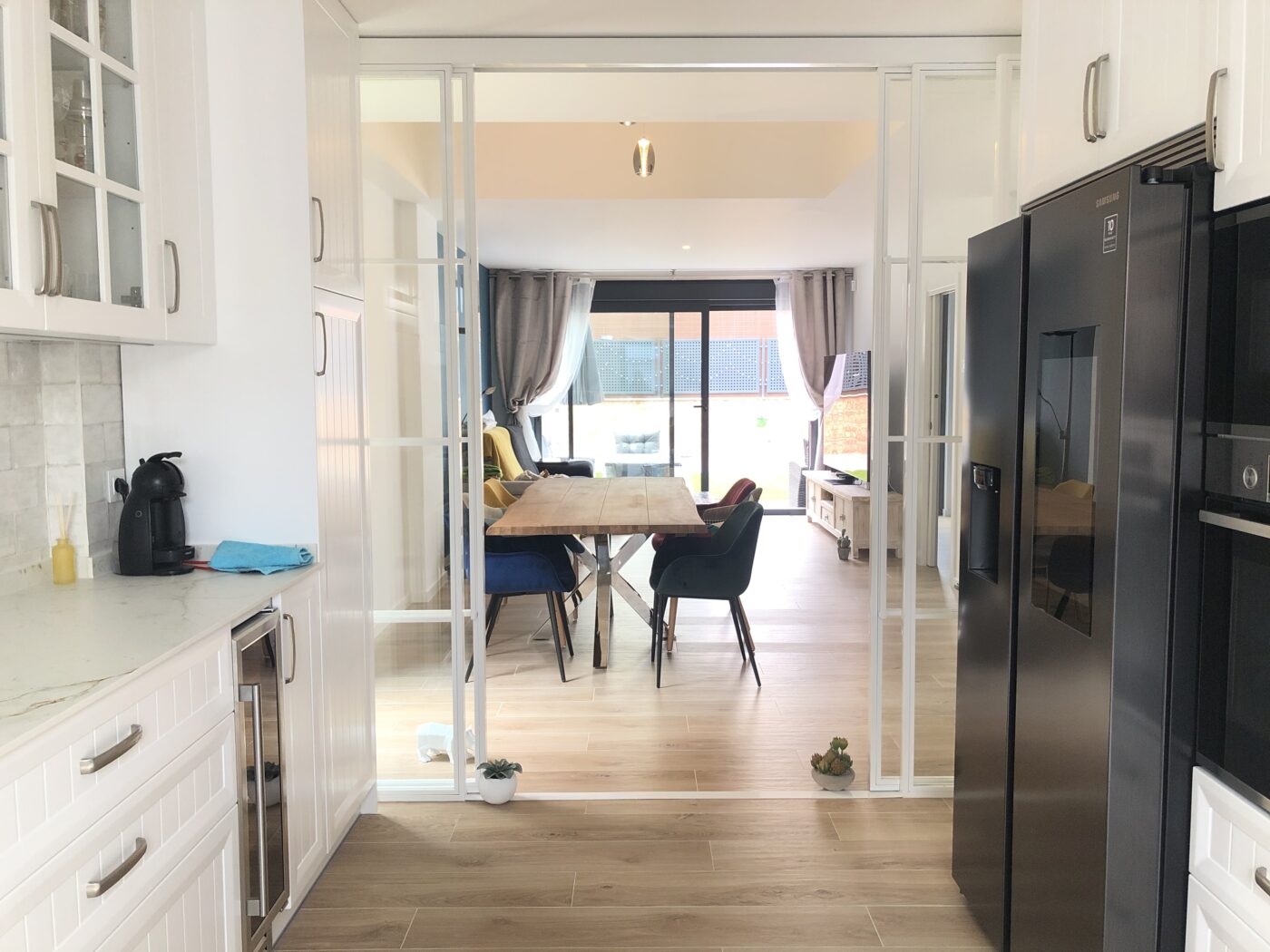 La cocina fue otro de los elementos fundamentales de esta vivienda, cambiando una cocina estandarizada por una hecha totalmente a medida que se comunicaba con el amplio salón. Nuestro equipo de interioristas diseñó unas puertas de forja con cristales que permitían tener siempre una vista panorámica de la estancia.